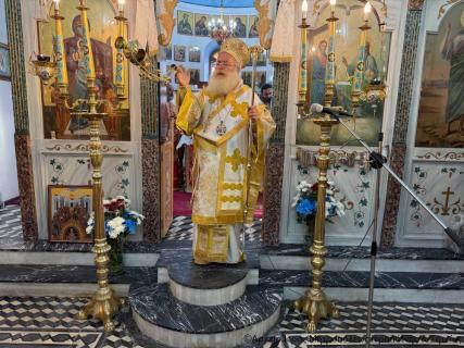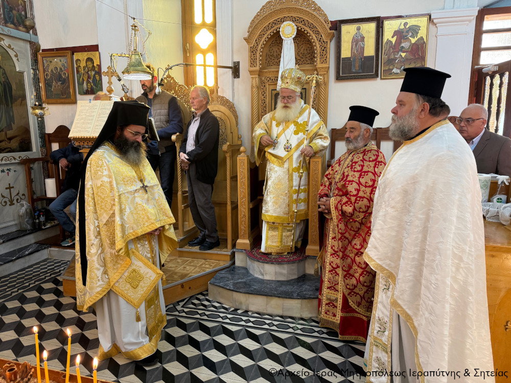 Στην Αρχιερατική θεία Λειτουργία έλαβαν μέρος ο Πανοσιολ. Αρχιμ. Αμβρόσιος Σκαρβέλης, Πρωτοσύγκελλος της Ι. Μητροπόλεως, ο Αιδεσιμ. πρωτ. Κωνσταντίνος Ταβλαδάκης, συνταξιούχος Εφημέριος, ο Αιδεσιμ. Γεώργιος Καλύβας, Εφημέριος της Ενορίας και ο Διάκονος Θεμιστοκλής Μπεϊνάς.