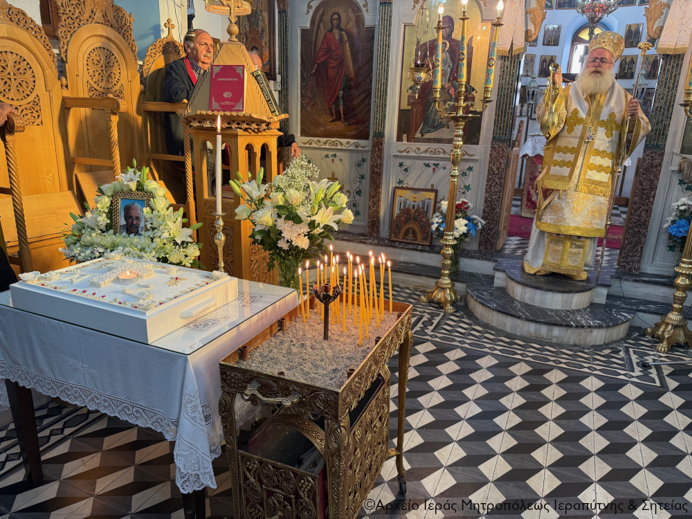 Την Κυριακή 23 Νοεμβρίου 2025 ο Σεβ. Μητροπολίτης Ιεραπύτνης και Σητείας κ. Κύριλλος, χοροστάτησε στην ακολουθία του Όρθρου και στη συνέχεια ιερούργησε και τέλεσε το τεσσαρακονθήμερο μνημόσυνο υπέρ αναπαύσεως της ψυχής του μακαριστού Πολυχρονίου Ζερβού, στον Ιερό Ενοριακό Ναό Αγίας Τριάδος στη Μαρωνιά Σητείας.