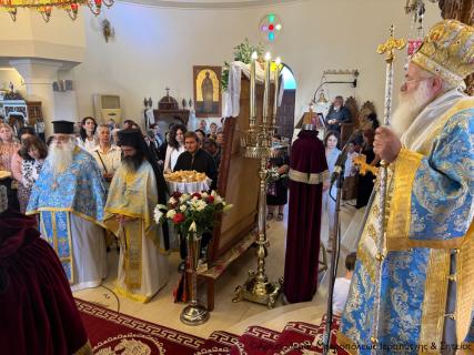 Στην Αρχιερατική Θεία Λειτουργία της πανηγύρεως του Ιερού Προσκυνήματος έλαβαν μέρος ο Πανοσιολ. Αρχιμ. Αμβρόσιος Σκαρβέλης, Πρωτοσύγκελλος της Ι. Μητροπόλεως, ο Πανοσιολ. Αρχιμ. Φιλήμων Μπέτσος, ο Αιδεσιμ. Πρωτ. Σάββας Λιναρδάκης, Προϊστάμενος του Ιερού Ναού Παναγίας Ελεούσας Ιεράπετρας και Εφημέριος του πανηγυρίζοντος Προσκυνήματος, ο Αιδεσιμολ. Πρωτ. Αθανάσιος Ταρλαντέζος, Εφημέριος και Προϊστάμενος του Ι. Μητροπολιτικού Ναού Αγίου Γεωργίου Ιεράπετρας, και ο Διάκονος Θεμιστοκλής Μπεϊνάς, ενώ έψαλαν ο Πρωτοψάλτης κ. Ιωάννης Αρώνης, Διευθυντής της Σχολής Βυζαντινής Μουσικής της Ιεράς Μητροπόλεως, στο δεξιό αναλόγιο και ο κ. Ευάγγελος Φραγκούλης με τον Ιεροψάλτη του ναού κ. Εμμαν. Μεταξάκη στον αριστερό χορό. Εκκλησιάστηκε πλήθος ευσεβών χριστιανών της περιοχής, μεταξύ των οποίων ήταν και η Βουλευτής Λασιθίου κ. Κατερίνα Σπυριδάκη.