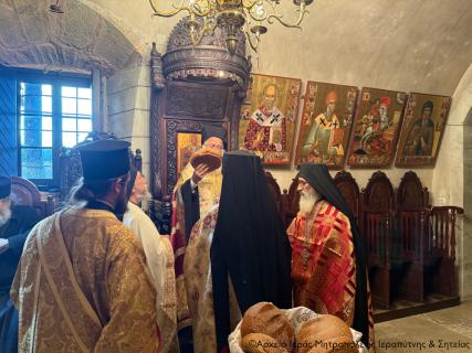 Κατά τη Θεία Λειτουργία συλλειτούργησαν ο εορτάζων Ηγούμενος της Ιεράς Μονής Πανοσιολ. Αρχιμ. Αμβρόσιος Σκαρβέλης, ο Πανοσιώτατος Προηγούμενος Αρχιμ. Φιλόθεος Σπανουδάκης, ο Πανοσιολ. Αρχιμ. Φιλήμων Μπέτσος και ο Διάκονος Θεμιστοκλής Μπεϊνάς, ενώ παρέστη συμπροσευχόμενος ο Πανοσιολ. Αρχιμ. Δημήτριος Στρατής, Αν. Καθηγητής της Π.Α.Ε.Α.Κ.