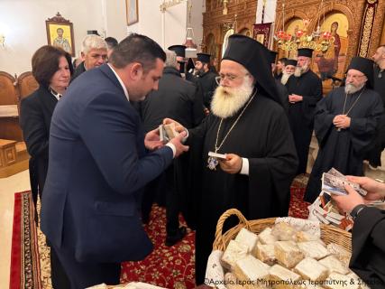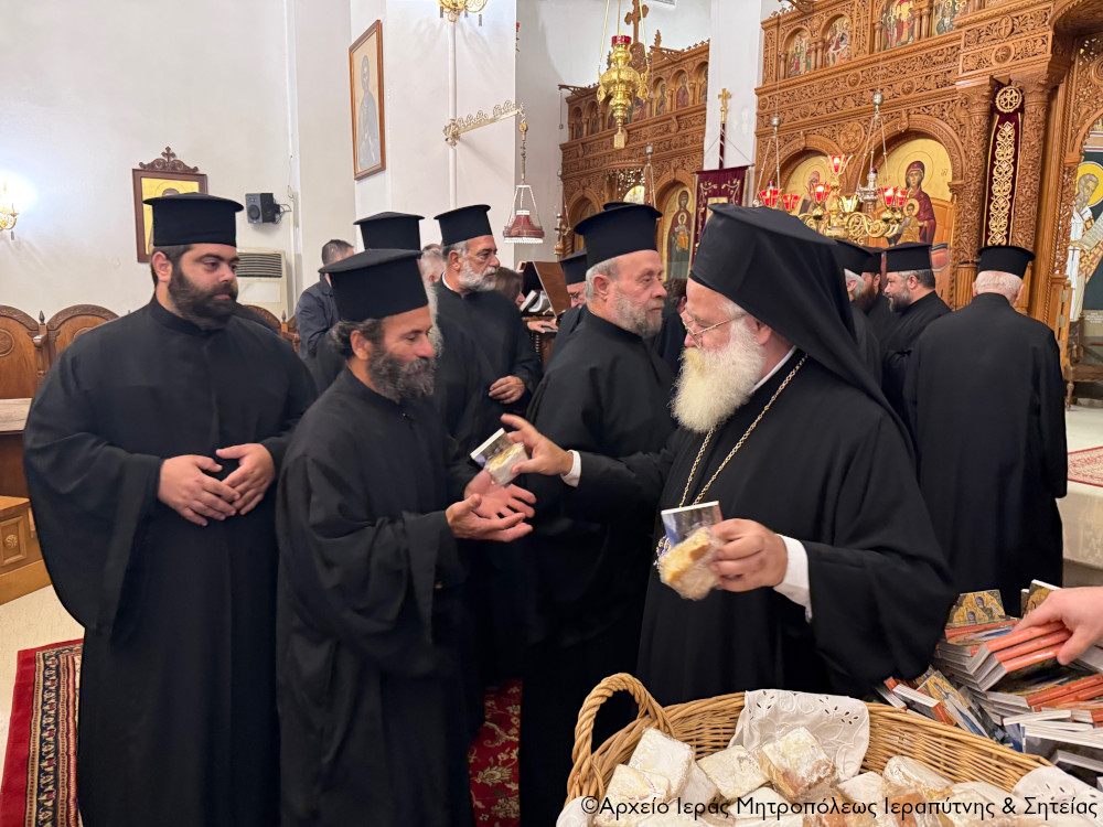 Στη συνέχεια ο Σεβασμιώτατος ευχαρίστησε τον Πανοσιολ. Πρωτοσύγκελλο Αρχιμ. Αμβρόσιο Σκαρβέλη και όλους τους Κληρικούς και ιδιατέρως τους συνταξιούχους Εφημέριους, που φυλάσσουν Θερμοπύλες στα συνεχώς φθίνοντα από ανθρώπους χωριά τους. Επίσης, ευχαρίστησε τον Ηγούμενο της Ι. Μονής Φανερωμένης Πανοσιολ. Αρχιμ. Παΐσιο Δερμιτζάκη για την αποπεράτωση της συνήρησης του κεντρικού κτηριακού συγκροτήματος του ιστορικού μοναστηριού της Ιεράπετρας που με θρύλους και παραδόσεις, και κυρίως με τη χάρη της Παναγίας έχει σφραγίσει τον τόπο, καθώς και την Περιφέρεια Κρήτης και τον Περιφερειάρχη κ. Στ. Αρναουτάκη, για τη συνδρομή τους στο έργο. Ευχαρίστησε ακόμα τον Πανοσιολ. Αρχιμ. Πορφύριο Αγγελάκη για τις εργασίες της συντήρησης και αποκατάστασης των εξωτερικών όψεων του Ι. Καθεδρικού Ναού Αγίας Φωτεινής Ιεράπετρας, τον Αιδεσιμολ. Πρωτ. Αθανάσιο Ταρλαντέζο για το έργο της αποκατάστασης του Ι. Ναού Αγίου Σπυρίδωνος στην παλιά πόλη, που βρίσκεται σε τελικό στάδιο παρά τα πολλά γραφειοκρατικά εμπόδια, και τους Εφημερίους των άλλων Ενοριών που εκτελούν έργα συντήρησης των ναών τους. Επιπλέον ευχαρίστησε τον Πρωτοψάλτη και Δ/ντή της Σχολής Βυζ. Μουσικής της Ι. Μητροπόλεως κ. Ιωάννη Αρώνη και τους συνεργάτες του καθηγητές Βυζ. Μουσικής, τον υπεύθυνο της Σχολής Αγιογραφίας και Ψηφιδωτού στην Ιεράπετρα κ. Νικ. Γρινιεζάκη.