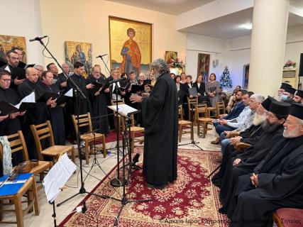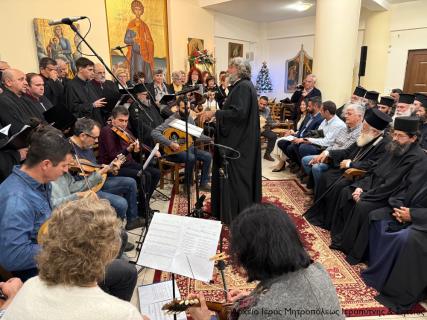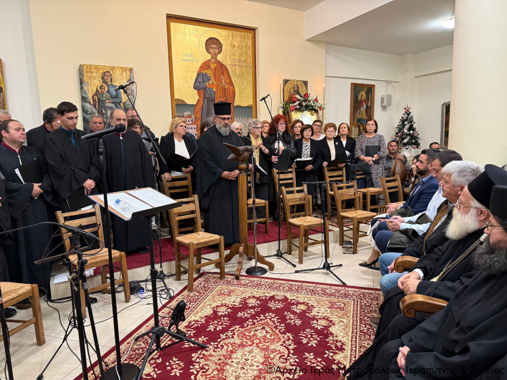 Η Χορωδία της Σχολής Βυζαντινής Μουσικής της Ιεράς Μητροπόλεως «Άγιος Ανδρέας ο Κρήτης», υπό τη διεύθυνση του Διευθυντή της Σχολής και Πρωτοψάλτου του Ι. Μ. Ναού Αγίου Γεωργίου Ιεράπετρας κ. Ιωάννη Αρώνη απέδωσε άρτια και με εξαιρετική μελωδικότητα και ενάργεια ύμνους και παραδοσιακά κάλαντα του αγίου Δωδεκαημέρου. Εψάλησαν το Απολυτίκιο της εορτής των Χριστουγέννων “Η Γέννησις σου Χριστέ ο Θεός ημών...” (ήχος δ΄), τα τροπάρια των Προφητειών του Εσπερινού της ίδιας εορτής “Λαθὼν ετέχθης...” και “Ανέτειλας Χριστέ...” (ήχος πλ. β΄), οι ειρμοί της α΄, γ΄ και θ΄ ωδής των Καταβασιών του Όρθρου της εορτής των Χριστουγέννων (ήχος α΄), το κάθισμα “Δεύτε ίδωμεν πιστοί” (ήχος δ΄), το “Και νυν...” των Αίνων της εορτής των Χριστουγέννων “Σήμερον ο Χριστός εν Βηθλεὲμ γεννάται εκ Παρθένου” και στίχοι από τη Δοξολογία του Σαρανταεκκλησιώτου (ήχος β'), ο ύμνος της εορτής της Περιτομής του Κυρίου “Συγκαταβαίνων ο Σωτήρ...” (ήχος πλ. δ΄), το δοξαστικό των Αίνων της εορτής του Μεγάλου Βασιλείου “Εξεχύθη η χάρις...” (πλ. β΄), το δοξαστικό της Θ΄ Ώρας της εορτής των Θεοφανείων “Την χείρα σου την αψαμένην την ακήρατον κορυφήν του Δεσπότου” (ήχος πλ. α΄) και τα στιχηρά των Αίνων της εορτής των Θεοφανείων “Φώς εκ φωτός...”, “Πως σε Χριστέ...” και «Το αληθινόν φως επεφάνη...».