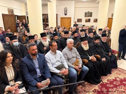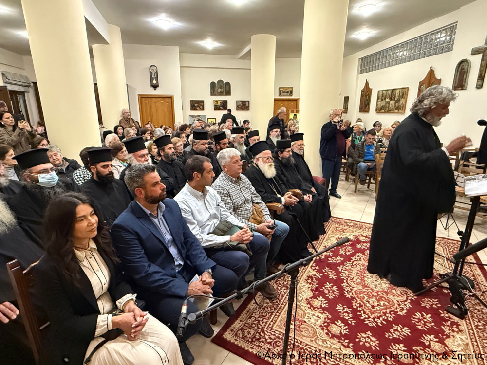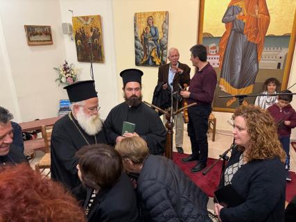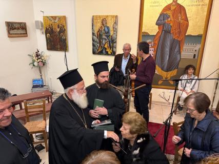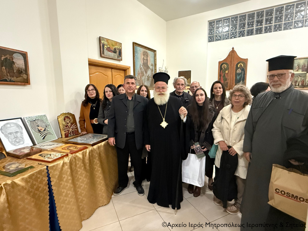 Επίσης, ο Σεβασμιώτατος συνεχάρη τον δάσκαλο της Αγιογραφίας και του Ψηφιδωτού κ. Νικόλαο Γρινιεζάκη και τους κάθε ηλικίας μαθητές και μαθήτριες της σχολής που συμμετείχαν στην έκθεση αγιογραφίας, τον Αιδεσιμολογιώτατο εφημέριο του Ι. Μητροπ. Ναού Πρωτ. Αθανάσιο Ταρλαντέζο, ο οποίος εύστοχα και με θεολογικό λόγο παρουσίασε την εκδήλωση, και την πρεσβυτέρα του Στυλιανή και τους συνεργάτες τους που ετοίμασαν κεράσματα για όλους τους παρισταμένους.