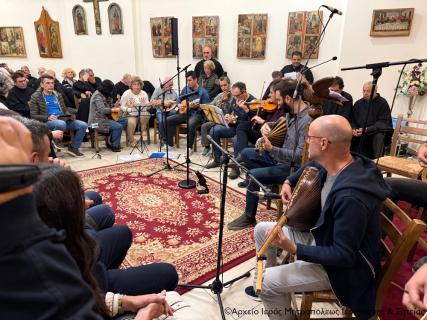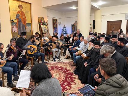 Ακολούθησαν τα κάλαντα που απέδωσαν από κοινού η Χορωδία των Ιεροψαλτών, μαθητές και η «Χορωδία παραδοσιακού τραγουδιού» της σχολής με τη συνοδεία παραδοσιακών μουσικών οργάνων από τους διδάσκοντες και διδασκομένους των τμημάτων της Παραδοσιακής Μουσικής της Σχολής. Ακούστηκαν τα Βυζαντινά Κάλαντα της περιοχής Κοτυώρων του Πόντου “Άναρχος Θεός καταβέβηκεν”, τα Ποντιακά κάλαντα των Χριστουγέννων, τα κάλαντα Σμύρνης, τα «Γεραπετρίτικα» κάλαντα, παραλλαγή από περιοχές ανατολικά της Ιεράπετρας όπως τα κατέγραψε ο Μουσικοδιδάσκαλος κ. Βαγγέλης Βαρδάκης, και τα Βυζαντινά Κάλαντα των Θεοφανείων.