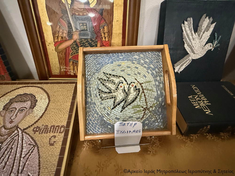 Κατά τη διάρκεια της εκδήλωσης εκτέθηκαν έργα των μαθητών της Σχολής Αγιογραφίας και Ψηφιδωτού της Ιεράς Μητροπόλεώς μας, Στον χαιρετισμό και το καλωσόρισμα του ο Αγιογράφος κ. Νικόλαος Γρινιεζάκης, υπεύθυνος και δάσκαλος της Σχολής, επεσήμανε ότι «η σχολή λειτουργεί με την ευλογία και τη συνεχή πατρική φροντίδα του Σεβ. Μητροπολίτου μας κ. Κυρίλλου, τον οποίο ευχαριστούμε θερμά για τη σήριξη και εμπιστοσύνη του, για να κρατήσουμε ζωντανή την ιερή παράδοση της Εκκλησίας και να τη μεταδώσουμε στις νεώτερες γενιές. Η αγιογραφία δεν είνα απλώς ζωγραφική. Είναι η γλώσσα της Εκκλησίας, ένας τρόπος με τον οποίο εκφράζεται η πίστη μας. Η εικόνα δεν στοχεύει να εντυπωσιάσει αλλά να οδηγήσει τον άνθρωπο σε προσευχή και εσωτερική σιωπή. Μέσα από τα χρώματα, τα πρόσωπα και τα σύμβολα, η αγιογραφία μας φανερώνει την αλήθεια της πίστης και μας θυμίζει ότι ο Θεός έγινε άνθρωπος για τη σωτηρία όλων μας. Δίκαια χαρακτηρίστικαν οι εικόνες ως βιβλία των αγραμμάτων. Το Ψηφιδωτό, από την άλλη πλευρά, είναι μια τέχνη υπομνής και επιμονής. Κάθε μικρή ψηφίδα τοποθετείαι με φροντίδα, ώστε όλες μαζί να δημιουργούν μια ενιαία εικόνα.Όπως στην Εκκλησία ο κάθε άνθρωπος έχει τη δική θέση και αξία, έτσι και στο ψηφιδωτό ακόμα και το πιο μικρό κομμάτι είναι απαραίτητο για την ολοκλήρωση του έργου».