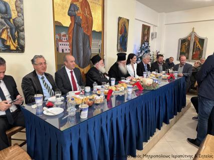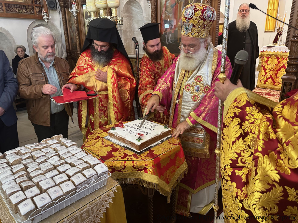 Πριν την απόλυση ο Σεβ. ευλόγησε την Βασιλόπιτα της Ενορίας και ευχήθηκε εγκάρδια στους παρισταμένους εκπροσώπους των Αρχών και σε όλο το εκκλησίασμα ο «νέος ενιαυτός της χρηστότητος του Κυρίου» να είναι για όλους ειρήνης, καταλλαγής, ομόνοιας, συναδέλφωσης, συμπόρευσης και αγάπης, κάνοντας πράξη αυτό που ζητούμε καθημερινά από τον Πανοικτίρμονα και Φιλεύσπλαχνο Θεό σε κάθε Ιερή Ακολουθία και ιδιαίτερα στη Θεία Λειτουργία, να μας αξιώσει να διέλθουμε «τον υπόλοιπον χρόνον της ζωής ημών εν ειρήνη και μετανοία», και να εμπιστευθούμε την αβεβαιότητα, τις αγωνίες, τους φόβους και τις ανασφάλειές μας στην παντοδύναμη πρόνοιά Του.