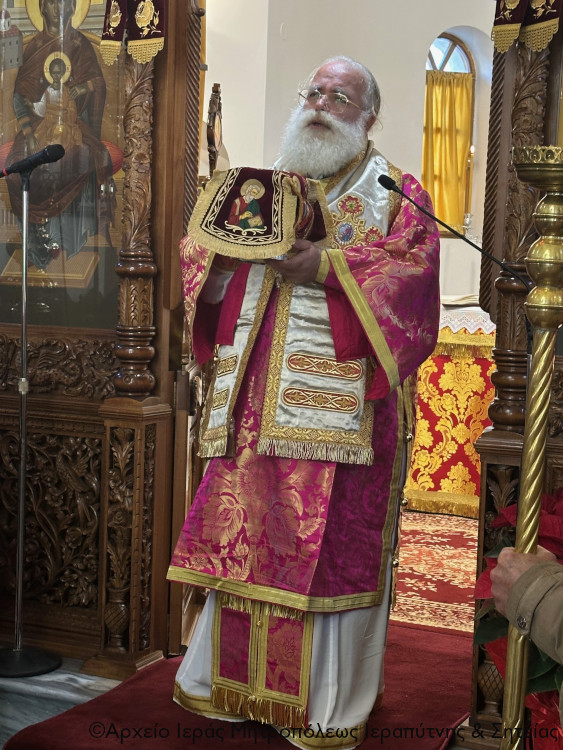 Στο μήνυμά του ο Σεβασμιώτατος αναφέρθηκε στη Δεσποτική εορτή της περιτομής του Κυρίου και στον εορταζόμενο άγιο Βασίλειο, ο οποίος «με την αγιασμένη ζωή του μιμήθηκε τον Χριστό στην κένωση και τη φιλανθρωπία», αποτελεί παράδειγμα για όλους μας, καθώς ήταν ο «ποιήσας και διδάξας» του Ευαγγελίου. Αναφορικά με το χρονικό οροθέσιο της έναρξης του νέου έτους σημείωσε ότι «καλούμαστε ως πιστοί άνθρωποι να γρηγορούμε και να αξιοποιούμε το κάθε λεπτό από την πολύτιμη δωρεά του χρόνου, καθώς και όλα τα άλλα δώρα και χαρίσματα που μας χάρισε ο Θεός «εξαγοραζόμενοι τον καιρόν», όπως μας προτρέπει ο Απόστολος Παύλος. Να μεταμορφώνουμε τον χρόνο σε «καιρόν ευπρόσδεκτον», σε ευκαιρία σωτηρίας και ανακαινίσεως […]. Η Εκκλησία με τις ετήσιες εορτές, τον εβδομαδιαίο εορταστικό κύκλο και τις ακολουθίες του νυχθημέρου εξαγιάζει και μεταμορφώνει τον χρόνο της καθημερινής ζωής, και παράλληλα τον ενοποιεί και τον προσανατολίζει στην εσχατολογική του προοπτική, δηλ. στη Βασιλεία του Θεού. Οι εορτές, και κυρίως οι Δεσποτικές, δεν αποτελούν απλές αναμνήσεις, αλλά «καιρούς», μοναδικές ευκαιρίες κοινωνίας με τον Χριστό και την αγία Εκκλησία Του».