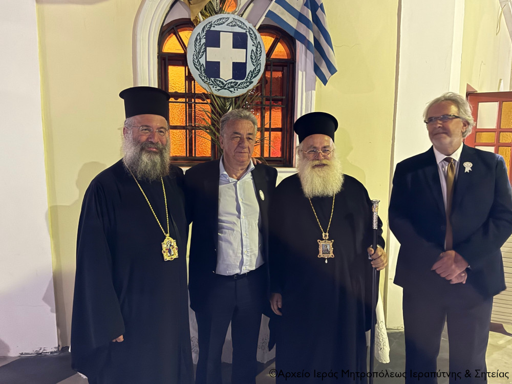 Ο Σεβ. Μητροπολίτης Ιεραπύτνης και Σητείας κ. Κύριλλος προσφώνησε κατάλληλα τον Σεβ. Μητροπολίτη Ρεθύμνης και Αυλοποτάμου κ. Πρόδρομο, τον οποίο καλοσώρισε με τη συνοδεία του στην πόλη της Σητείας με εγκάρδιους λόγους και τον ευχαρίστησε για τη μεγάλη ευλογία και την τιμή να κομίσει για πρώτη φορά στη Σητεία τις Τίμιες Κάρες των Αγίων Τεσσάρων Νεομαρτύρων των εν Ρεθύμνη μαρτυρησάντων Γεωργίου, Αγγελή, Μανουήλ και Νικολάου, προς προσκύνηση και ευλογία των πιστών της Ανατολικής Κρήτης, αποδεχόμενος την ταπεινή πρόσκληση.