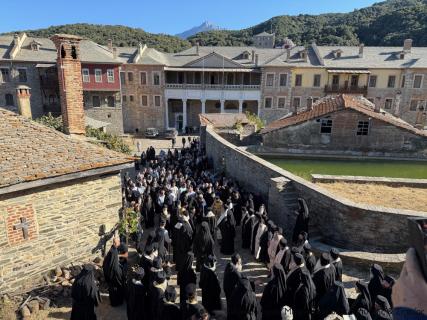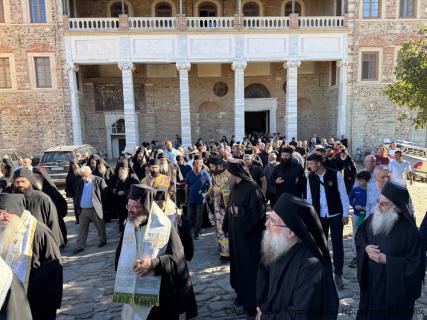 Περί ώρα 8.00 οι ως άνω Σεβ. Αρχιερείς και ο Ηγούμενος της Μονής Αρχιμ. Ναθαναήλ με σύσσωμη την Ιβηριτική Αδελφότητα υποδέχθηκαν το σεπτό σκήνωμα του Γέροντος στα προπύλαια της Μονής, το οποίο συνόδευε ο Σεβ. Μητροπολίτης Φιλαδελφείας κ. Μελίτων, και το εναπόθεσαν στο κέντρο του Καθολικού, όπου αναγνώσθηκε το ειθισμένο Τρισάγιο.