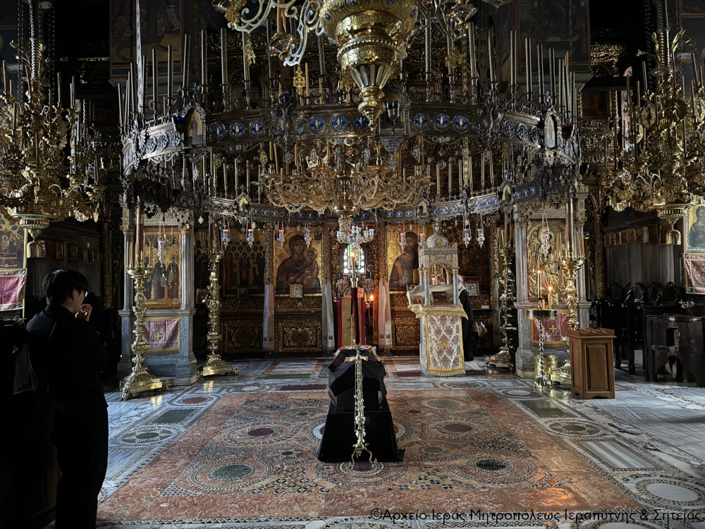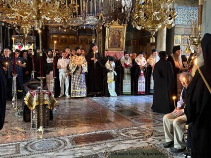 Τον Οικουμενικό Πατριάρχη Βαρθολομαίο εκπροσώπησε ο Σεβ. Μητροπολίτης Σύμης κ. Χρυσόστομος, οποίος το πρωί της Πέμπτης τέλεσε τη Θεία Λειτουργία στο παρεκκλήσιο της Παναγίας της Πορταΐτισσας. Πριν την Απόλυση τελέσθηκε Τρισάγιο υπέρ αναπαύσεως της ψυχής του μακαριστού Γέροντος, στο οποίο μετείχε και ο Σεβ. Μητροπολίτης Ιεραπύτνης και Σητείας κ. Κύριλλος.