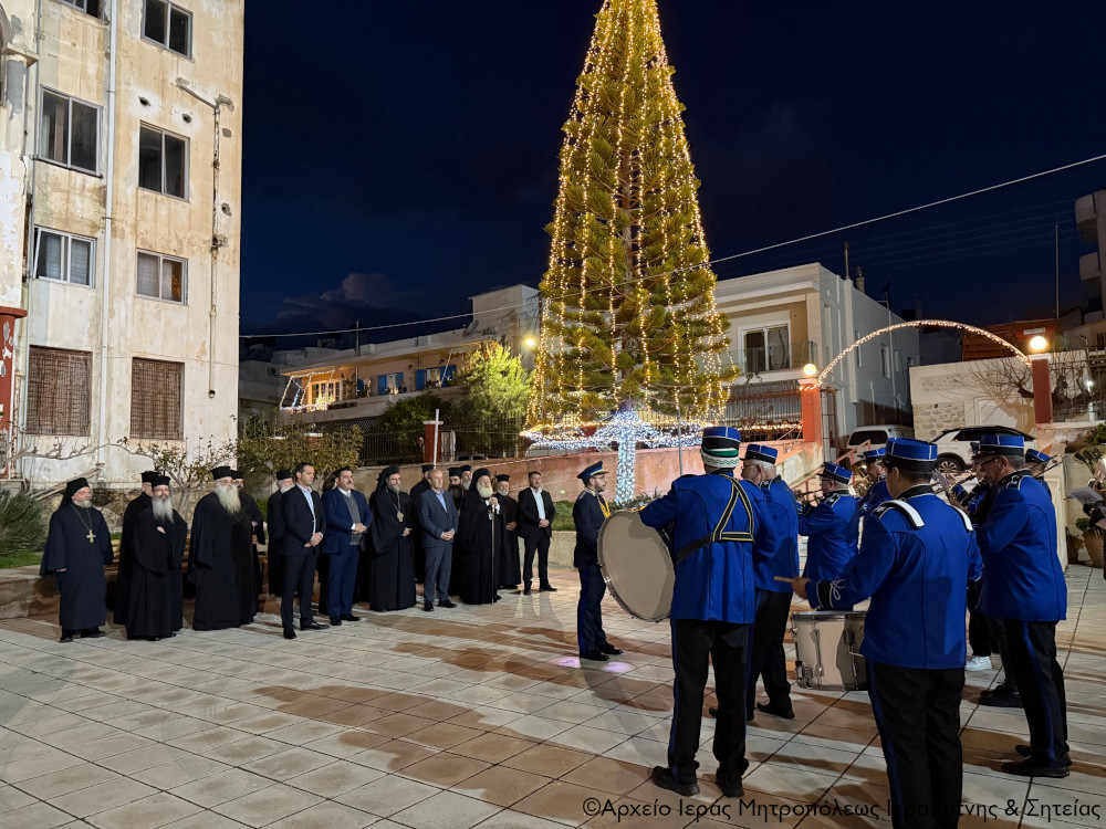 Τα μέλη της Φιλαρμονικής Ορχήστρας του Δήμου Ιεράπετρας, υπό τη διεύθυνση του μαέστρου Μάριου Μαμούτη, απέδωσαν τα παραδοσιακά κάλαντα της Πρωτοχρονιάς και άλλες εορταστικές μελωδίες, δίπλα από το φωταγωγημένο δέντρο του προαυλίου του ναού.