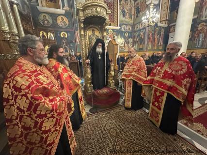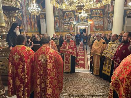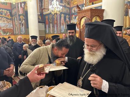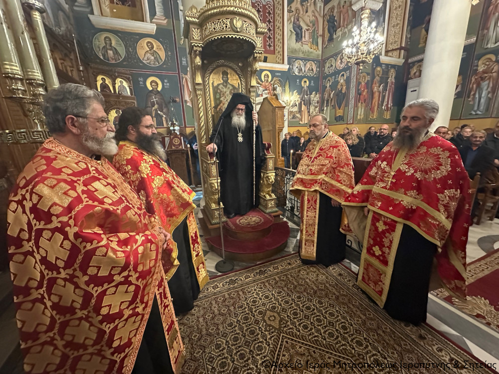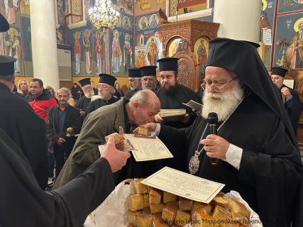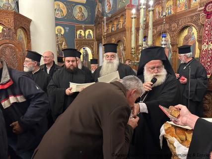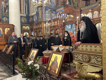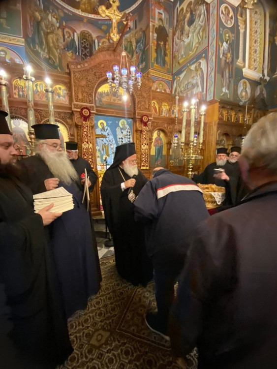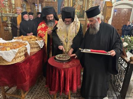 Ο Σεβ. κ. Ιωσήφ πριν την Απόλυση ευλόγησε την Βασιλόπιτα και μίλησε επίκαιρα για τη θεολογική σημασία του χρόνου στη ζωή των χριστιανών, με λόγο μεστό, βαθύτατα θεολογικό και πάντοτε επίκαιρο. Ευχαρίστησε τον Σεβ. κ. Κύριλλο για την πρόσκληση να χοροστατήσει στην Ακολουθία και ευχήθηκε σε όλους ευλογημένη χρονιά με υγεία και πνευματική προκοπή.