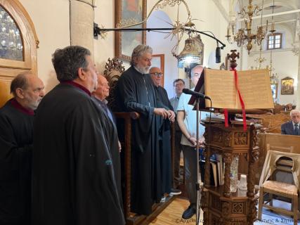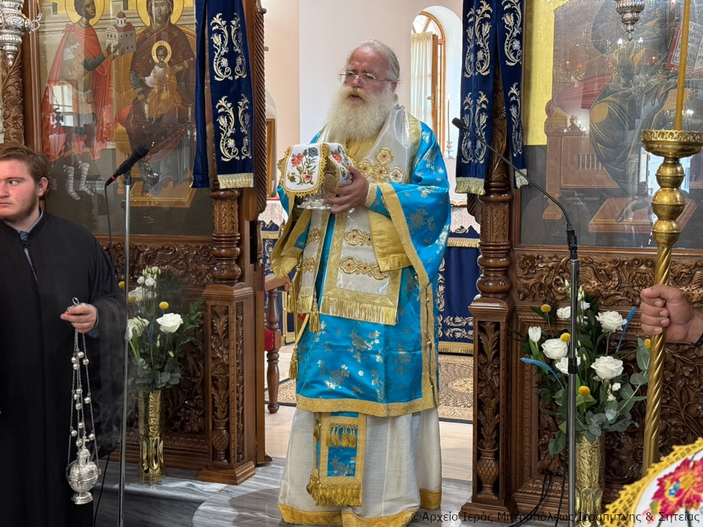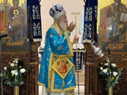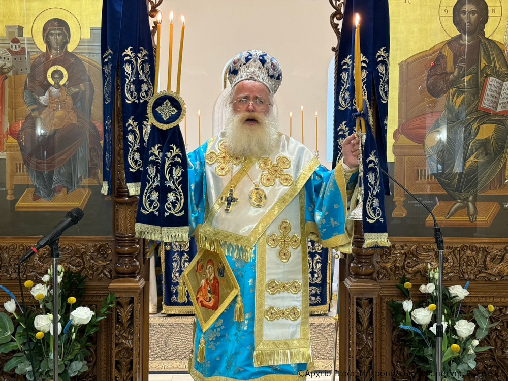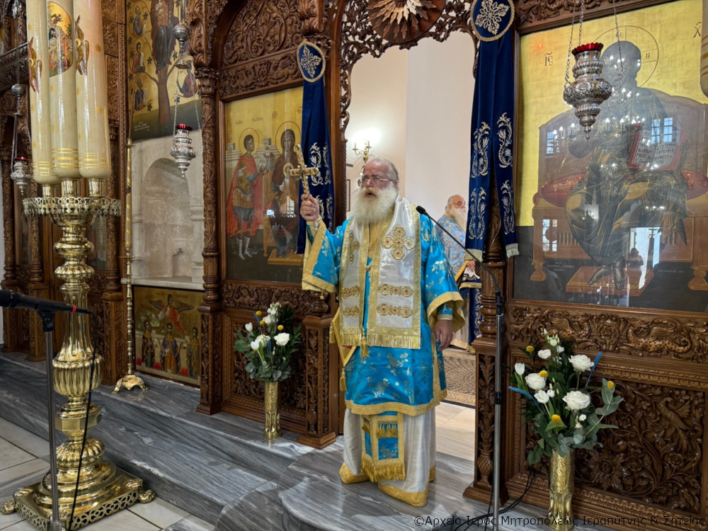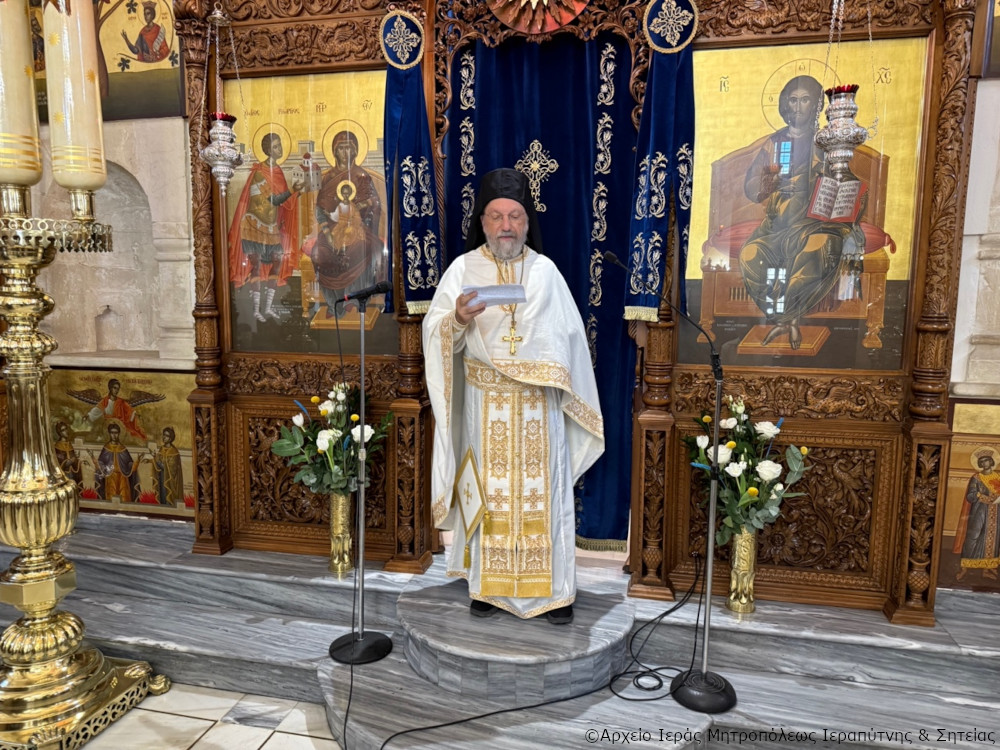 Κατόπιν προτροπής του Σεβασμιωτάτου κ. Κυρίλλου, τον θείο λόγο κήρυξε ο Πανοσιολ. Αρχιμ. Φιλήμων Μπέτσος, ο οποίος με λόγο γλαφυρό και απλό μίλησε για τη διπλή εορτή της Αγίας Σκέπης, “της Υπεραγίας Δεσποίνης ημών Θεοτόκου και Αειπαρθένου Μαρίας, της πάντοτε και κατ᾿ εξαίρετον τρόπον σκεπούσης το ευσεβές ημών έθνος” και της εθνικής επετείου του “ΟΧΙ”. Όπως τόνισε, το έπος του 1940 δεν ήταν μόνο ανθρώπινο κατόρθωμα, καθώς οι Έλληνες στρατιώτες πολλές φορές έβλεπαν την Παναγία και Υπέρμαχο Στρατηγό του Γένους μας, στα χαρακώματα και στα χιονοσμένα βουνά της Βορείου Ηπείρου, να τους σκεπάζει και να τους περιφρουρεί, όπως ο Άγιος Ανδρέας, ο δια Χριστός Σαλός, και ο μαθητής του Επιφάνιος είχαν δει αιώνες νωρίτερα την Θεοτόκο σε μια ολονύκτια Ακολουθία στον Ναό της Παναγίας των Βλαχερνών να προσεύχεται στον ουρανό και να σκεπάζει τον λαό με το ιερό μαφόριό της.