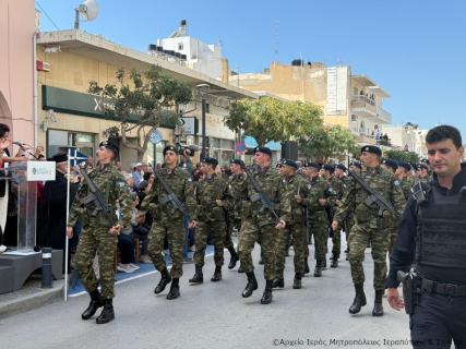 Στη συνέχεια οι εκπρόσωποι των Αρχών μετέβησαν στην οδό Δημοκρατίας, όπου υπό τους ήχους της Φιλαρμονικής του Δήμου Ιεράπετρας πραγματοποιήθηκε η καθιερωμένη παρέλαση, ενώ προηγήθηκε ο πανηγυρικός της ημέρας από τον κ. Ανδρέα Μιχελαράκη.