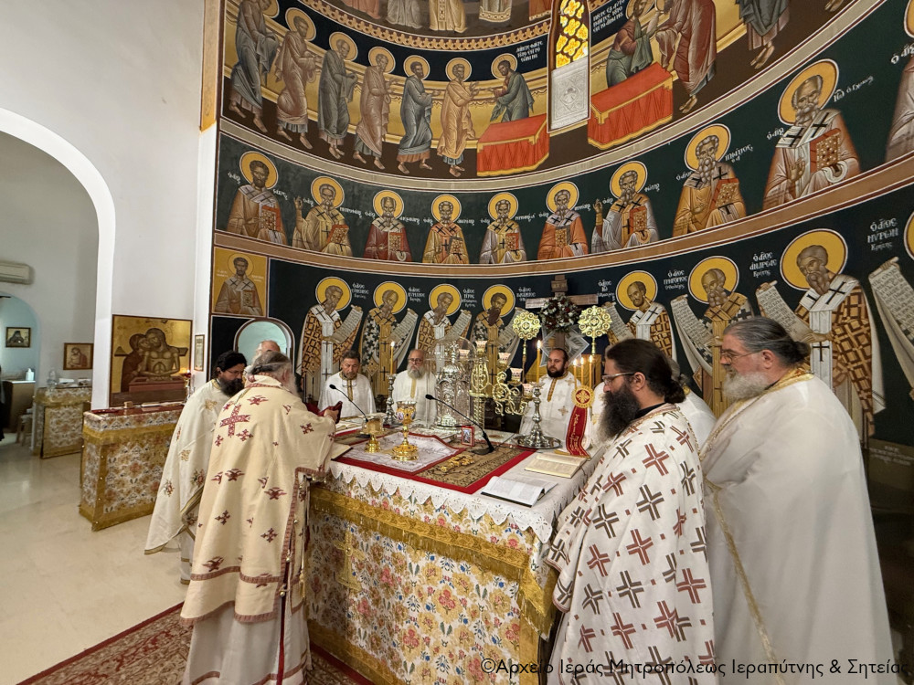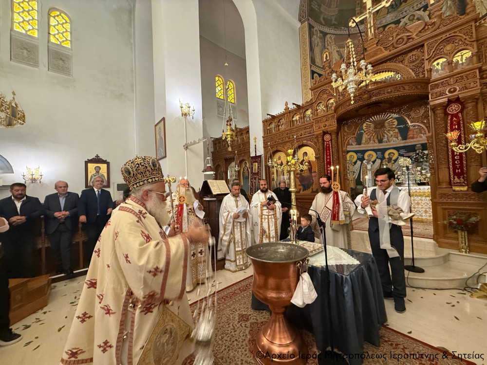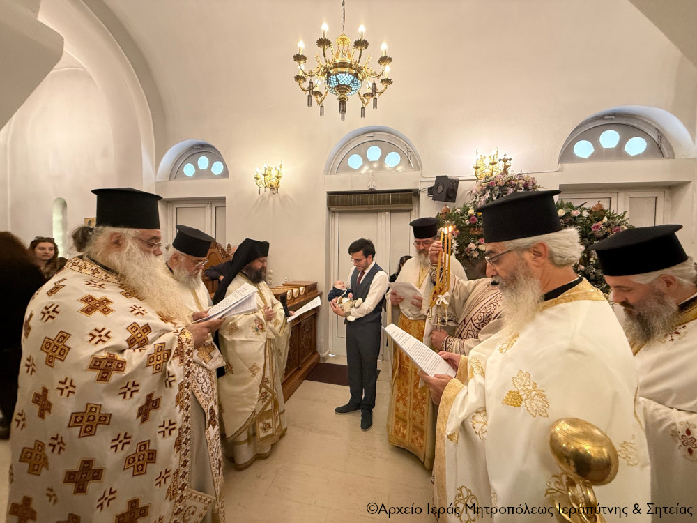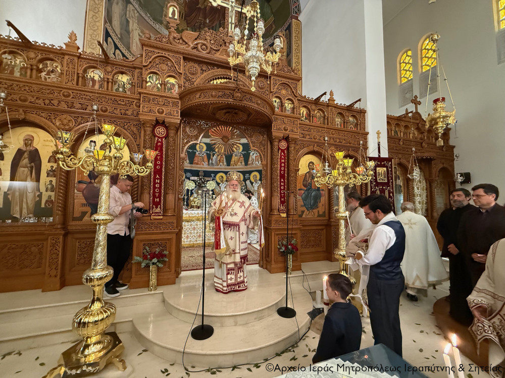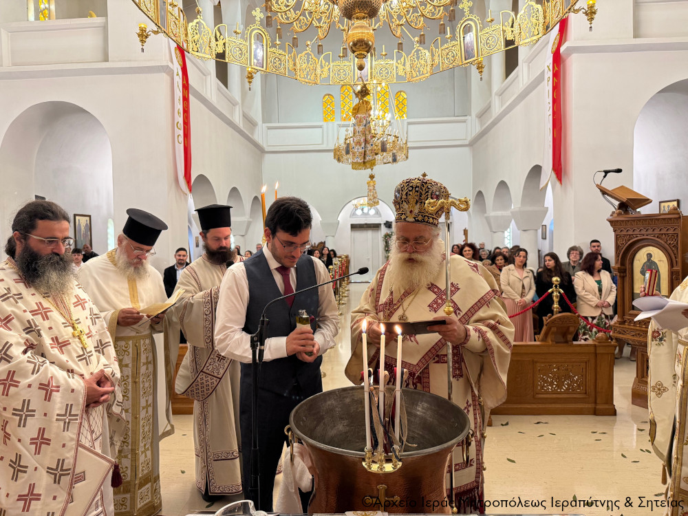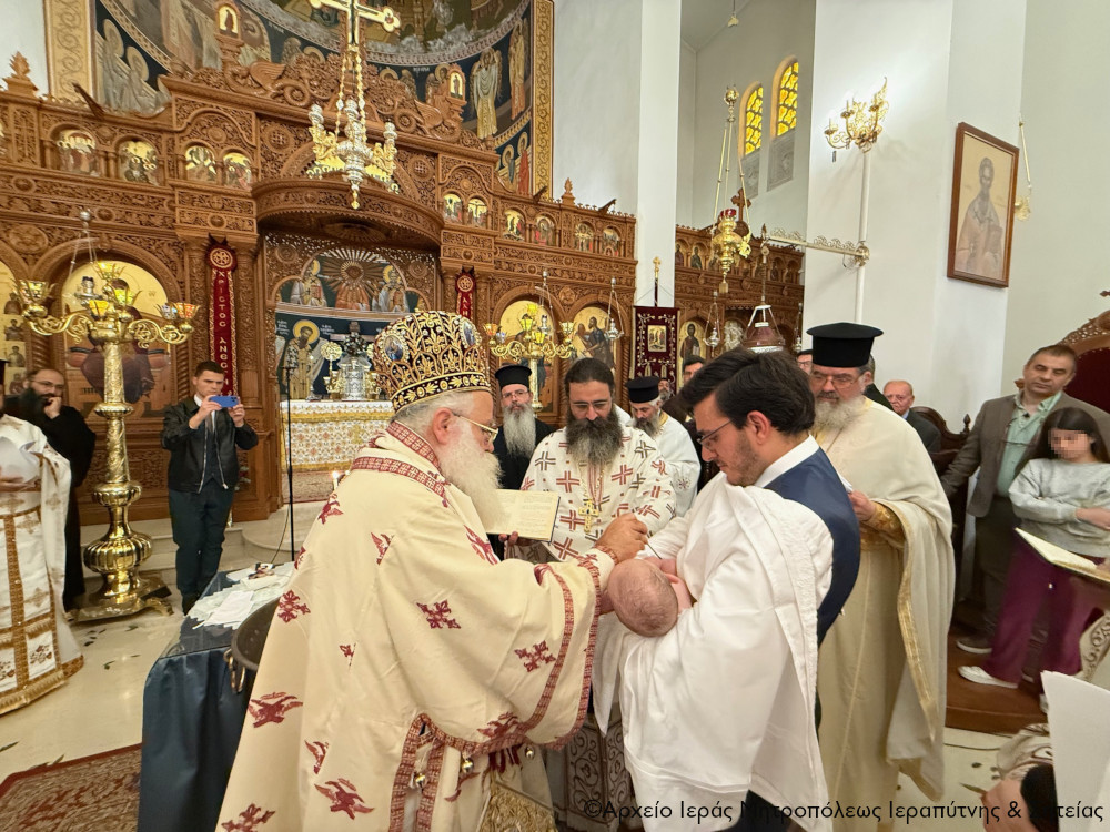 Το πρωί της Πέμπτης της Διακαινησίμου Εβδομάδος, 16 Απριλίου 2026, ο Σεβ. Μητροπολίτης Ιεραπύτνης και Σητείας κ. Κύριλλος χοροστάτησε στην Ακολουθία του Όρθρου και στη συνέχεια ιερούργησε στον Ιερό Καθεδρικό Ναό Αγίας Φωτεινής πόλεως Ιεράπετρας. Κατά τη διάρκεια της Αναστάσιμης Θείας Λειτουργίας, ο Σεβασμιώτατος τέλεσε τη βάπτιση του υιού του Διακόνου π. Θεμιστοκλή Μπεϊνά και της διακόνισσας Δωροθέας Κρητικού, που έλαβε το όνομα Μηνάς.