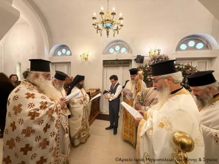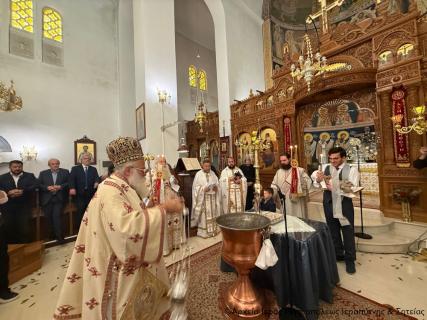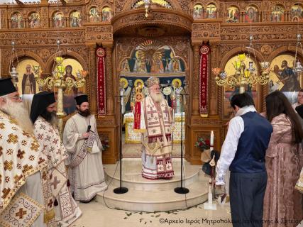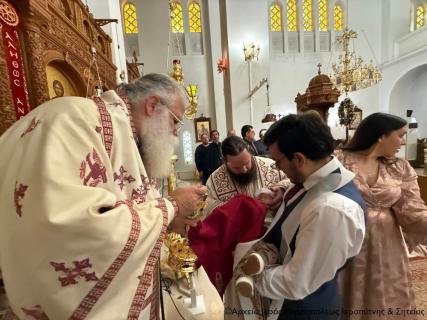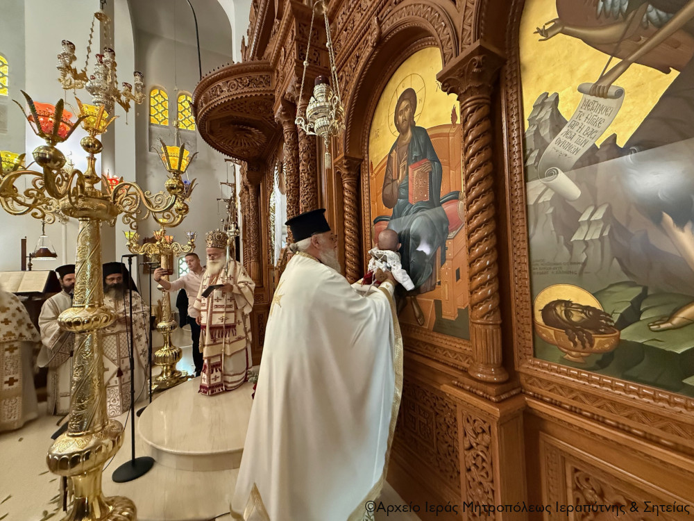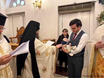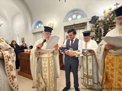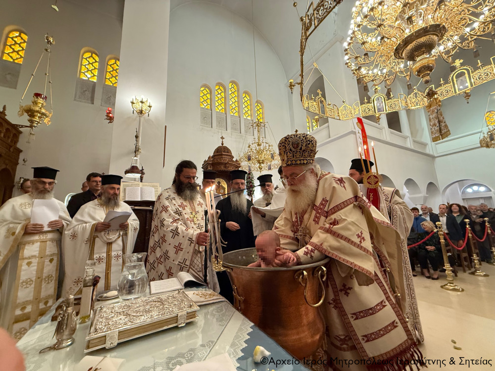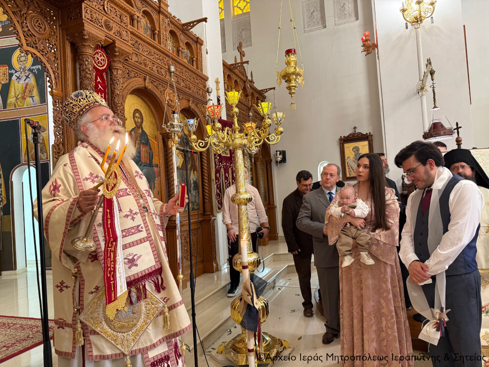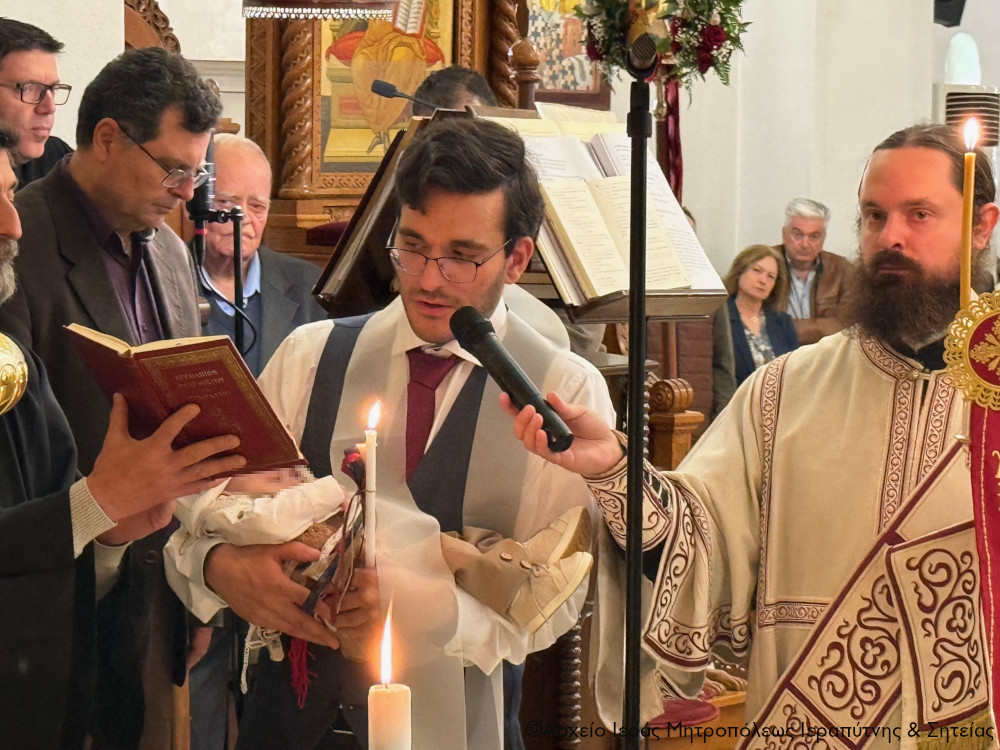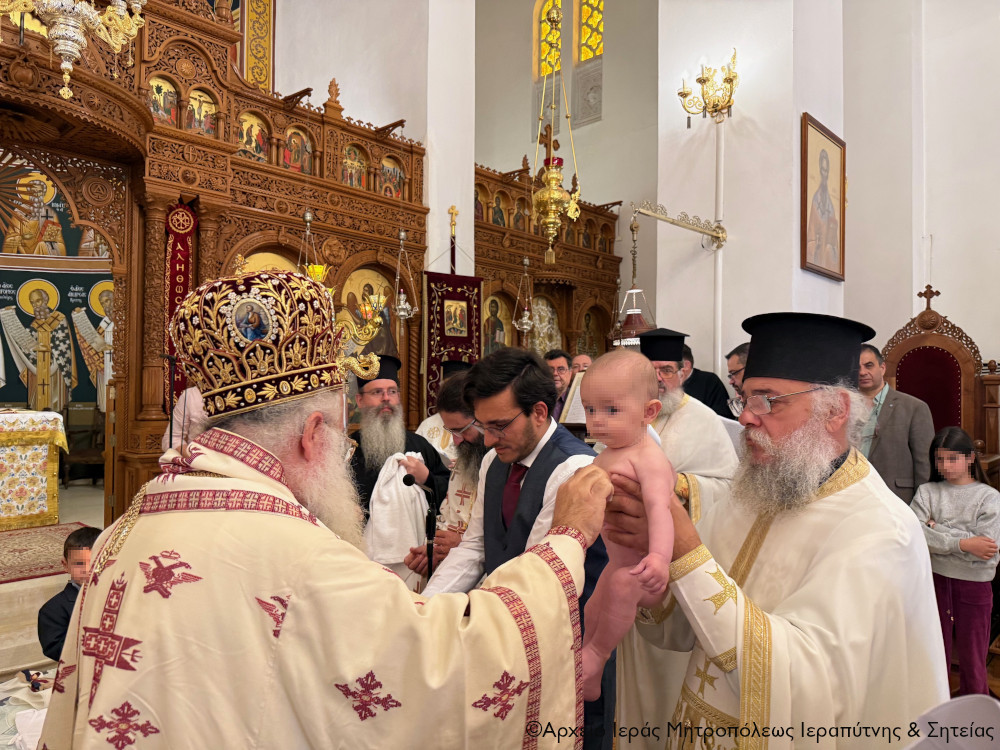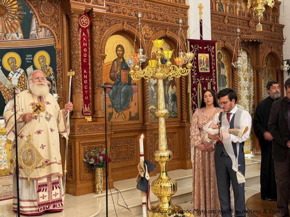 Μετά την Απόλυση της Αρχιερατικής Θείας Λειτουργίας ο Σεβ. Μητροπολίτης κ. Κύριλλος, αφού σημείωσε ότι κατά την αρχαία τάξη της Εκκλησίας μας το Μυστήριο του Βαπτίσματος τελούνταν εντός της Θείας Λειτουργίας, της οποίας ήταν αναπόσπαστο μέρος, ευχήθηκε από καρδιάς στους γονείς, τον Ιερολογιώτατο Διάκονο Θεμιστοκλή Μπεϊνά και τη διακόνισσα Δωροθέα Κρητικού, στους παππούδες και τις γιαγιάδες, καθώς και στον ανάδοχο του παιδιού Γεώργιο Καζανάκη, να είναι καλοφώστο το νέο μέλος του Σώματος του Χριστού, να έχει τη Χάρη του Αναστάντος Κυρίου στη ζωή του και να ενεργοποιεί συνεχώς τα χαρίσματα του Αγίου Πνεύματος που έλαβε κατά το Χρίσμα, αμέσως μετά το Βάπτισμα, ώστε να γίνει ένας καλός χριστιανός και χρήσιμος πολίτης στην κοινωνία μας.