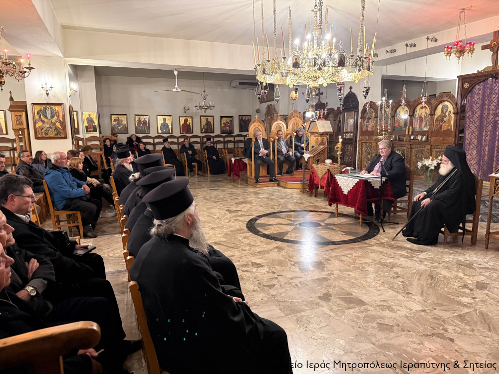 Ακολούθησε επίκαιρη ομιλία από τον κ. Γεώργιο Σαμουράκη, Διδάκτορα Θεολογίας και Διδάσκοντα της Πατριαρχικής Ανωτάτης Εκκλησιαστικής Ακαδημίας Κρήτης (Π.Α.Ε.Α.Κ), ο οποίος ανέπτυξε το θέμα: «Ο Λόγος προς Ποιμένα του αγίου Ιωάννη της Κλίμακος».