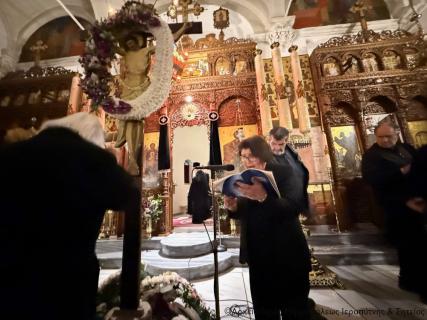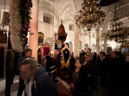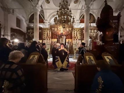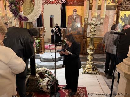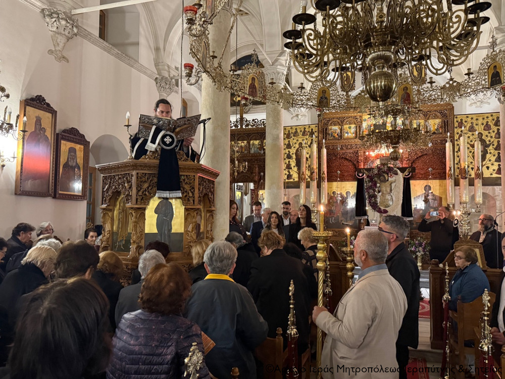 Ο Σεβασμιώτατος κατά την τάξη ανέγνωσε το πρώτο και εκτενέστερο από τα δώδεκα Ευαγγέλια της Ακολουθίας, το επονομαζόμενο «Ευαγγέλιον της Διαθήκης», από το κατά Ιωάννην Ευαγγέλιο, καθώς και ορισμένα από τα Δώδεκα εναλλάξ με τον πρωτ. Αθανάσιο Ταρλαντέζο, ο οποίος και τέλεσε την έξοδο του Σταυρού από το Ιερό Βήμα. Μετά την απόλυση ο Σεβ. κ. Κύριλλος ευχήθηκε προς όλους τα δέοντα, ενώ κατά το έθος της Ανατολικής Κρήτης η κ. Γαρυφαλιά Μιχελάρου έψαλλε δίπλα στον Εσταυρωμένο την «Παρισταμένη».