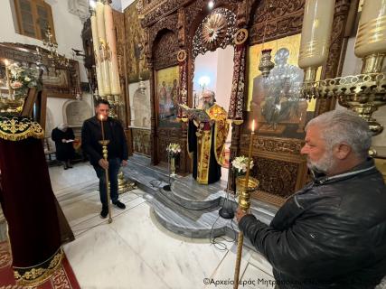 Επίσης, ο Σεβ. κ. Κύριλλος υπογράμμισε ότι όλοι μας είμαστε υπόχρεοι στο ιερό πρόσωπο της Παναγίας Μητέρας του Κυρίου μας, της Υπέρμαχου Στρατηγού του Γένους μας και πνευματικής Μητέρας όλων των χριστιανών, η οποία αποτέλεσε την εκλεκτή πασών των γενεών για να υπηρετήσει σχέδιο της θείας οικονομίας για τη σωτηρία του ανθρώπου. Τέλος παρότρυνε όλοι να την παρακαλέσουμε να μας περισκέπει και να μας προστατεύει από κάθε πειρασμό και κακό, και να είναι συμπαραστάτης και συνοδοιπόρος μας στον πνευματικό αγώνα μας κατά το στάδιο της Αγίας και Μεγάλης Τεσσαρακοστής, ώστε να αξιωθούμε να εορτάσουμε το Πάσχα απελευθερωμένοι από τα πάθη και τις αμαρτίες μας.