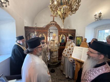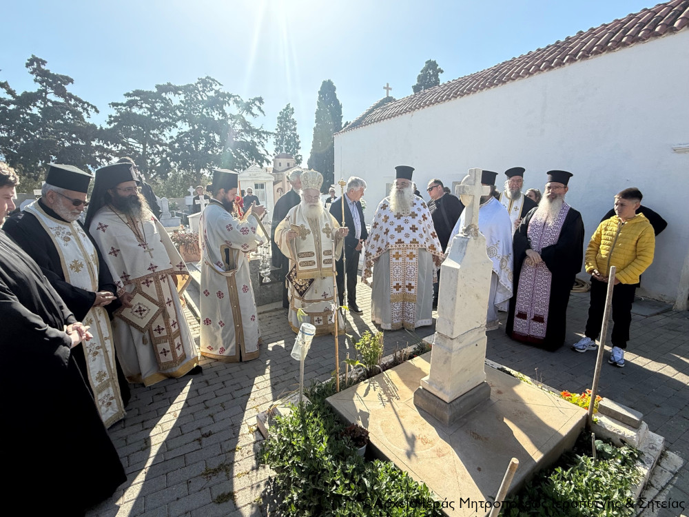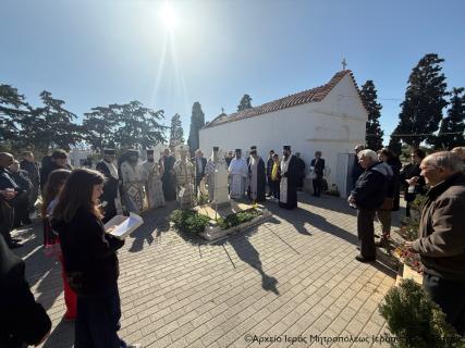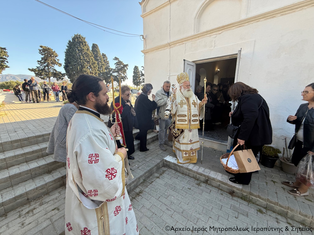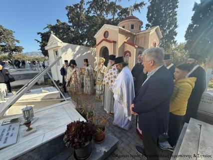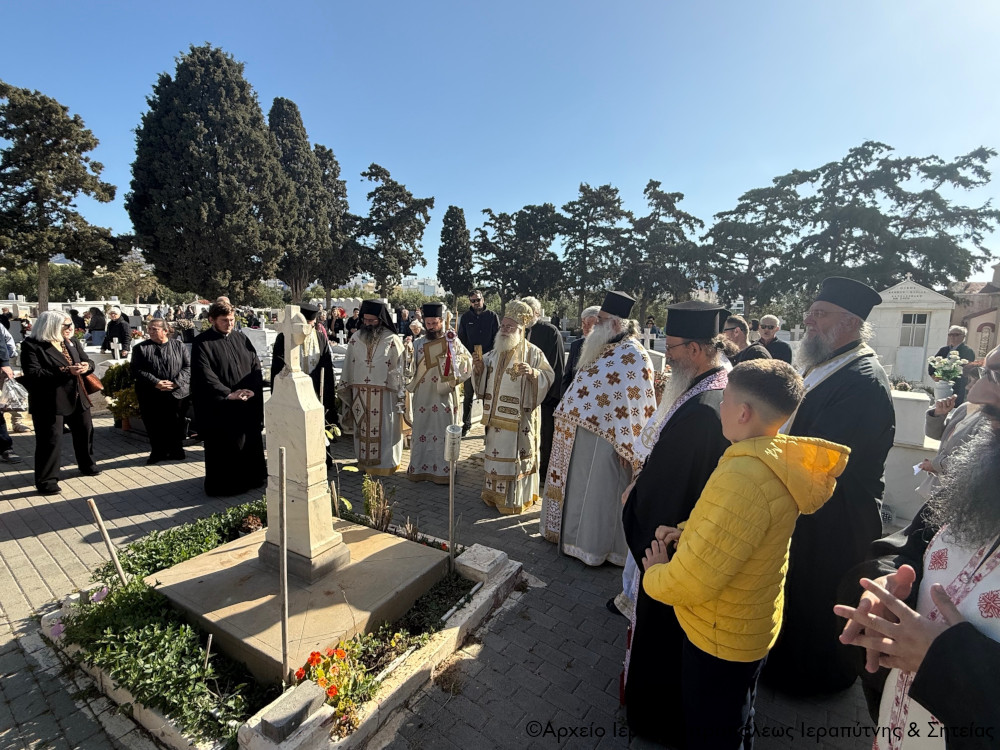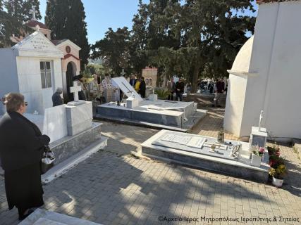 Πριν την Απόλυση της Αρχιερατικής Θείας Λειτουργίας ο Σεβασμιώτατος, περιστοιχούμενος από τον Πρωτοσύγκελλο Αρχιμ. Αμβρόσιο Σκαρβέλη και τον Ιερό Κλήρο της πόλης, τέλεσε τα προγραμματισμένα ιερά μνημόσυνα των μακαριστών Γεωργίου Βασιλάκη (τρίμηνο), Βασιλείου Μπλαζαντωνάκη (τρίμηνο), Κωνσταντίνου Ατσαλή (εξάμηνο), Χριστίνας Χρυσοφάκη (τρίμηνο), Μαρίας Γιαννικάκη (εξάμηνο), Μαρίας Φρονιμάκη-Λυκοπούλου (ετήσιο), Ιωάννου Χρυσοφάκη (τριετές), Ιωάννου (συναπάντημα) και Έλλης Λαντζανάκη (συναπάντημα). Στο τέλος ευχήθηκε ο εκ νεκρών Αναστάς Κύριος ημών Ιησούς Χριστός, και Νικητής του θανάτου να αναπαύει μέσα στο Αναστάσιμο Φως Του τις ψυχές των κεκοιμημένων για τους οποίους τελέσθηκε το ιερό μνημόσυνο και πάντων των αναπαυομένων στο Κοιμητήριο της πόλης.