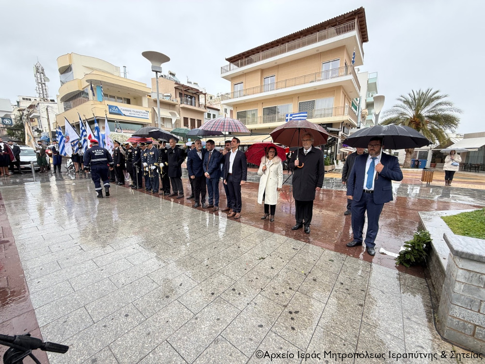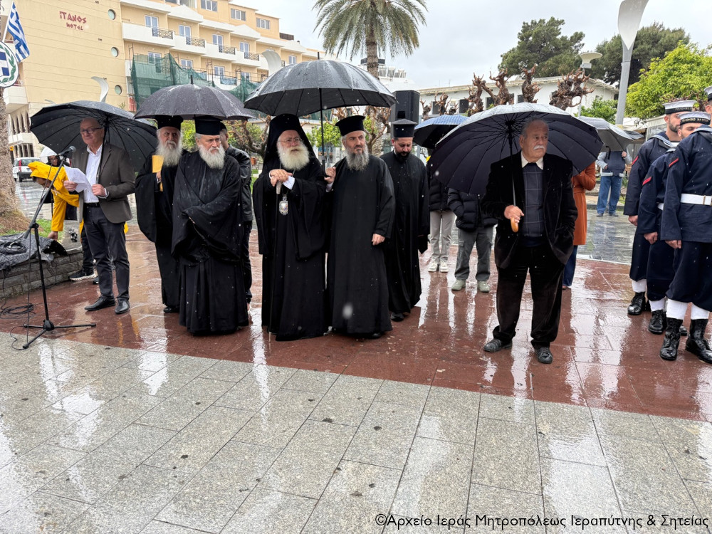 Έπειτα, παρά τις αντίξοες καιρικές συνθήκες, μπροστά στο Μνημείο του Αγνώστου Στρατιώτη, στην κεντρική πλατεία Σητείας, ο Σεβ. Μητροπολίτης Ιεραπύτνης και Σητείας κ. Κύριλλος, περιστοιχούμενος από τους Ιερείς της πόλεως, τέλεσε επιμνημόσυνη δέηση «υπέρ μακαρίας μνήμης και αιωνίου αναπαύσεως πάντων των πατέρων και αδελφών ημών, των ηρωικώς αγωνισαμένων και ενδόξως πεσόντων εν τοις ιεροίς του έθνους ημών αγώσι πάλαι τε και επ᾽ εσχάτων».