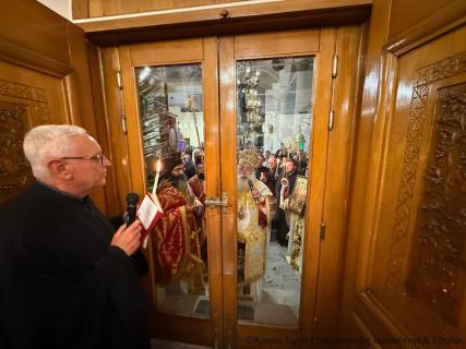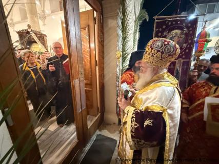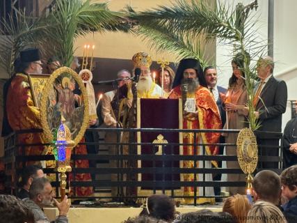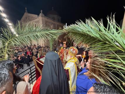 Επακολούθησε το «Άρατε πύλας άρατε» στην είσοδο του ναού και στη συνέχεια ο Σεβ. κ. Κύριλλος χοροστάτησε στην Ακολουθία του Όρθρου της Αναστάσεως, ανέγνωσε τον Κατηχητήριο Λόγο του Ιερού Χρυσοστόμου και προέστη της πανηγυρικής Θείας Λειτουργίας της Κυριακής του Πάσχα.