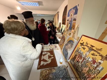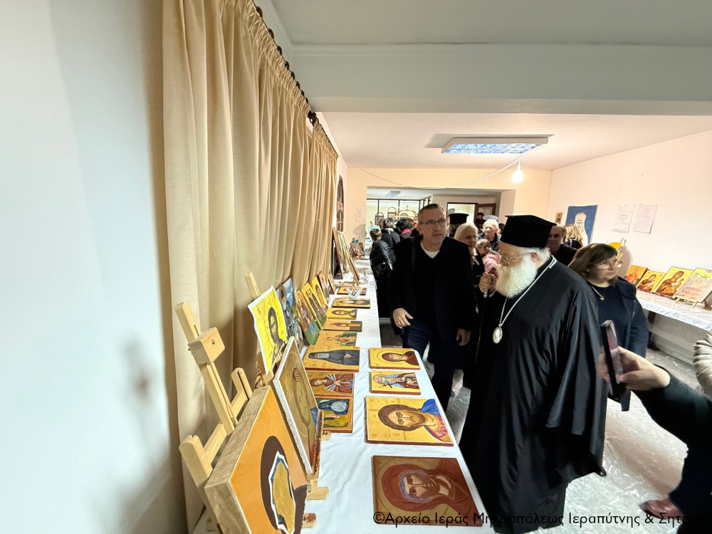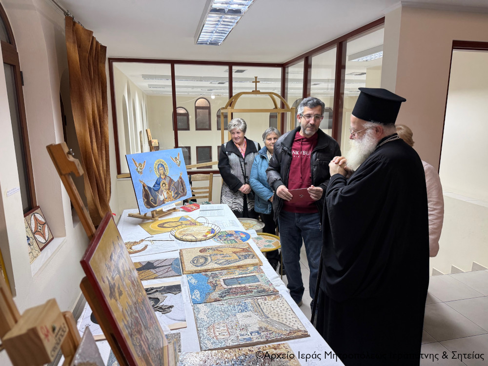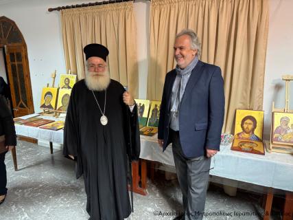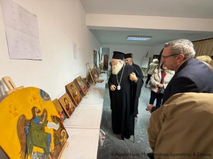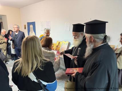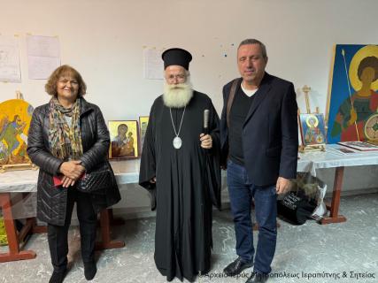 Ο Σεβ. κ. Κύριλλος μοίρασε σε όλους τους Χορωδούς και τους συντελεστές της εκδήλωσης την κάρτα του με τις πασχαλινές ευχές του και ακολούθως μετέβη συνοδευόμενος από τον πανοσιολ. Πρωτοσύγκελλο Αρχιμ. Αμβρόσιο Σκαρβέλη και τους λοιπούς Κληρικούς, καθώς και τον παριστάμενο Δήμαρχο Σητείας κ. Γεώργιο Ζερβάκη στην αίθουσα του ναού που στεγάζεται η Σχολή Αγιογραφίας και Ψηφιδωτού, και ξεναγήθηκε στα έργα που εξέθεσαν οι μαθητές της σχολής.
