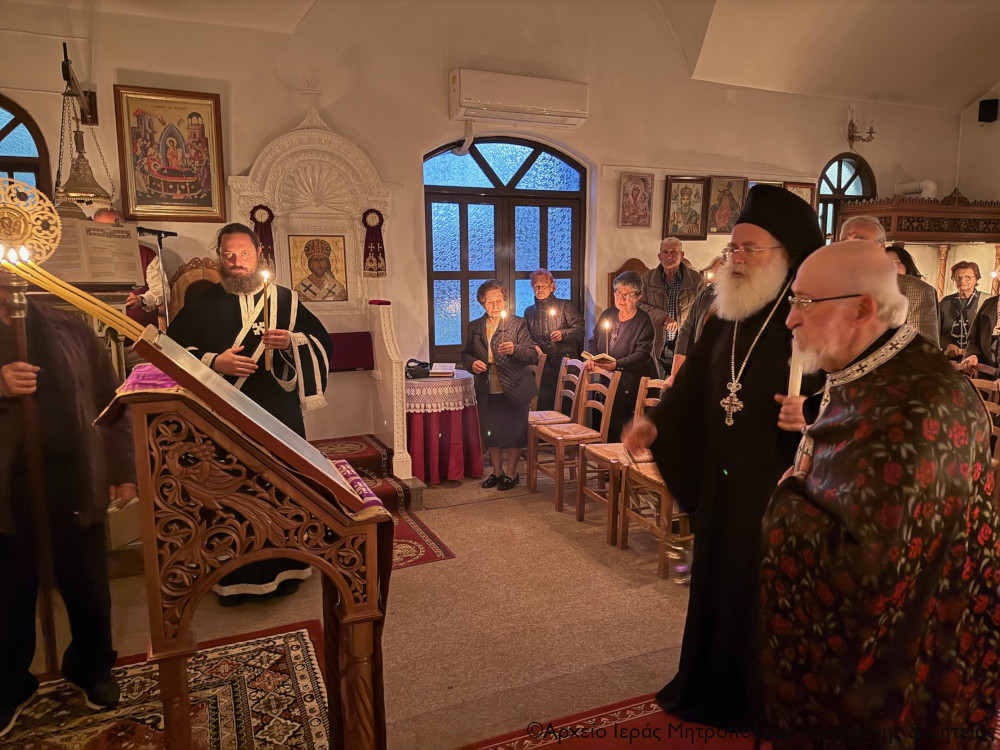 Στο τέλος της ακολουθίας ο Σεβασμιώτατος κ. Κύριλλος ευχήθηκε ευλογημένη Αγία και Μεγάλη Εβδομάδα, συμπορευόμενοι όλοι με τον Νυμφίο Κύριό μας Ιησού Χριστό στην πορεία Του προς το εκούσιο Πάθος, προκειμένου να μην μείνουμε έξω του νυμφώνος του. Επίσης, εν συντομία αναφέρθηκε στα γεγονότα που προβάλλει και εορτάζει η Αγία Εκκλησία μας τη Μεγάλη Δευτέρα, δηλ. στον Πάγκαλο Ιωσήφ, που προτυπώνει τον ανεξίκακο Κύριο της Δόξης, και στην άκαρπη συκιά, που καταράστηκε ο Χριστός, επειδή είχε μόνο φύλα και όχι καρπούς.