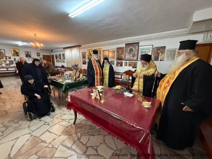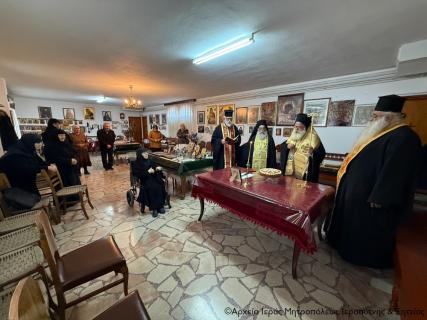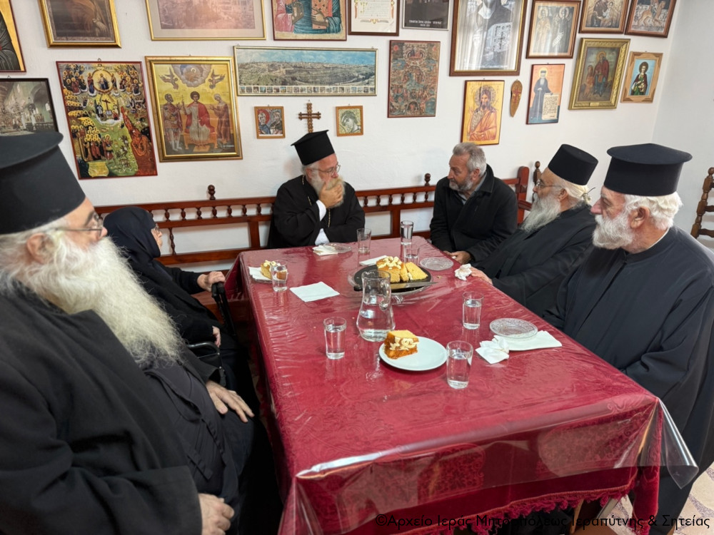 Μετά την ευλογία της Βασιλόπιτας, στο Αρχονταρίκι του μοναστηριού, ο Σεβ. Μητροπολίτης κ. Κύριλλος ευχήθηκε εγκάρδια στην Ηγουμένη Χριστονύμφη Μοναχή και στις Αδελφές της Μονής το νέο έτος να είναι ευλογημένο, ειρηνικό, με υγεία και πνευματική καρποφορία. Ακολούθησε η διανομή της Βασιλόπιτας και μοναστηριακό κέρασμα, και ο Σεβασμιώτατος συνομίλησε επί μακρόν και σε ιδιαίτερα εγκάρδια ατμόσφαιρα με την Οσιωτάτη Καθηγουμένη και τα μέλη της Αδελφότητας του Ι. Ησυχαστηρίου.