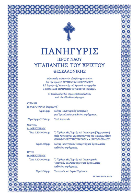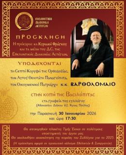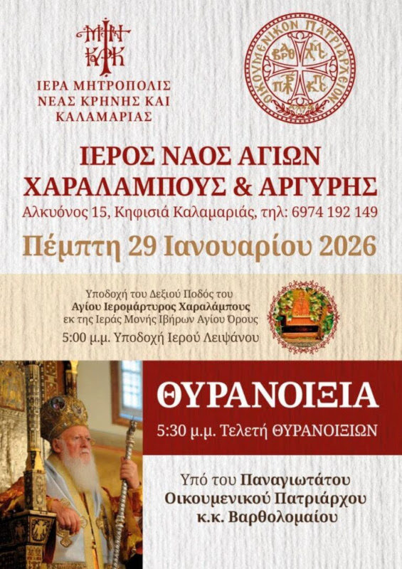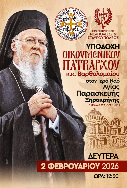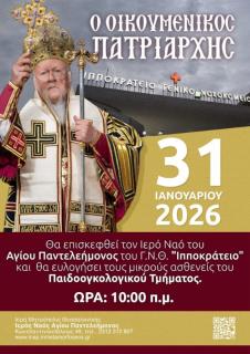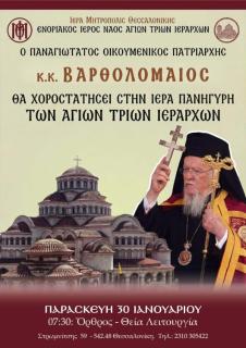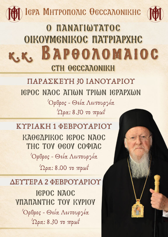 Η Α.Θ. Παναγιότης ο Οικουμενικός Πατριάρχης κ.κ. Βαρθολομαίος αναχώρησε σήμερα, Τετάρτη, 28 Ιανουαρίου 2026, από την έδρα του, για την Θεσσαλονίκη. Κατά την παραμονή του θα χοροστατήσει σε τρεις Ι. Ναούς της Ι. Μητροπόλεως Θεσσαλονίκης: Στον Ιερό Ναό Τριών Ιεραρχών, ανήμερα της εορτής, την Παρασκευή, 30 Ιανουαρίου, στον Καθεδρικό και Προσκυνηματικό Ναό της του Θεού Σοφίας, την Κυριακή, 1η Φεβρουαρίου, και στον βυζαντινό Ι. Ναό Υπαπαντής του Σωτήρος, ανήμερα της εορτής, 2 Φεβρουαρίου. Επίσης, θα προστεί των επετειακών εκδηλώσεων για την συμπλήρωση 155 ετών από την ίδρυση της Φιλοπτώχου Αδελφότητος Ανδρών Θεσσαλονίκης, και, μεταξύ άλλων, θα πραγματοποιήσει την κεντρική ομιλία στην επίσημη εκδήλωση του Α.Π.Θ. για την εορτή των Τριών Ιεραρχών, ενώ θα παραστεί στα εγκαίνια της επώνυμης Ακαδημαϊκής Έδρας “Μητροπολίτης Δράμας Παύλος – Εκκλησιαστική Ιστορία και Πολιτισμός του Ελληνισμού της Ανατολής 11ος – 20ος αιώνας” του τμήματος Θεολογίας του ιδίου Πανεπιστημίου. Επίσης θα επισκεφθεί το Παιδοογκολογικό Τμήμα του Ιπποκρατείου Νοσοκομείου, και θα τελέσει τα θυρανοίξια του Παρεκκλησίου του Διαβαλκανικού Ιατρικού Κέντρου Θεσσαλονίκης, καθώς, επίσης, θα ευλογήσει τις εγκαταστάσεις και το έργο της Εθελοντικής Διακονίας Αστέγων στον Άγιο Παύλο Θεσσαλονίκης.