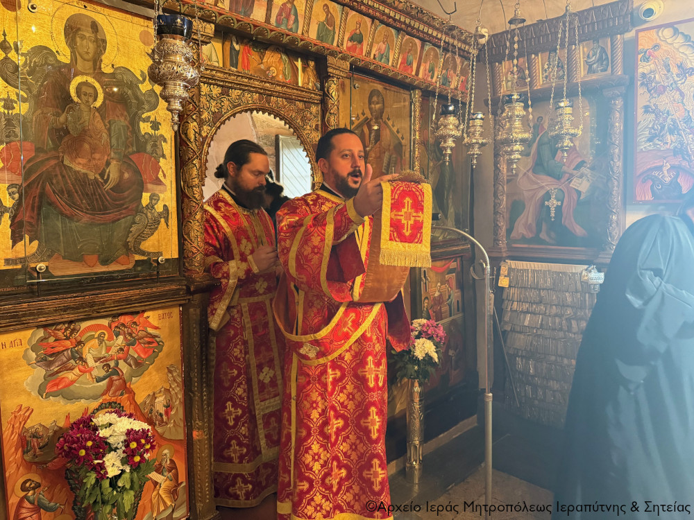 Έψαλλαν μελωδικότατα ο Καθηγητής και Έφορος της Σχολής Βυζαντινής Μουσικής της Ι. Μητροπόλεως στη Σητεία Αιδεσιμολ. Πρωτ. Νικόλαος Αλεξάκης με τους συνεργάτες του στον δεξιό χορό και οι Ιεροψάλτες της πανηγυρίζουσας Μονής κ. Γεώργιος Τσικαλάκης και κ. Γεώργιος Μαρκαντωνάκης με τους Ιεροσπουδαστές της Σ.Μ.Υ.Κ. Κρήτης στον αριστερό χορό.